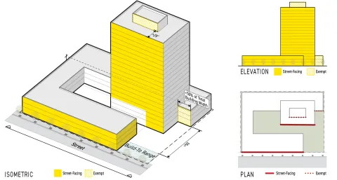 Upper Story Facade: Pursuant to Sec. 14.2.10.E. (Upper Story Facade), upper story facade is defined as the portions of the exterior building envelope at the perimeter of each upper story for the full height of the story.