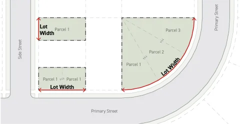 For measuring building width on irregular lot lines, see Sec. 14.2.14. (Irregular Lot lines).