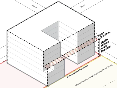 District boundary height transition is defined as a reduction in the maximum height of a building for a limited depth where abutting districts have substantially lower height allowances.